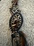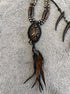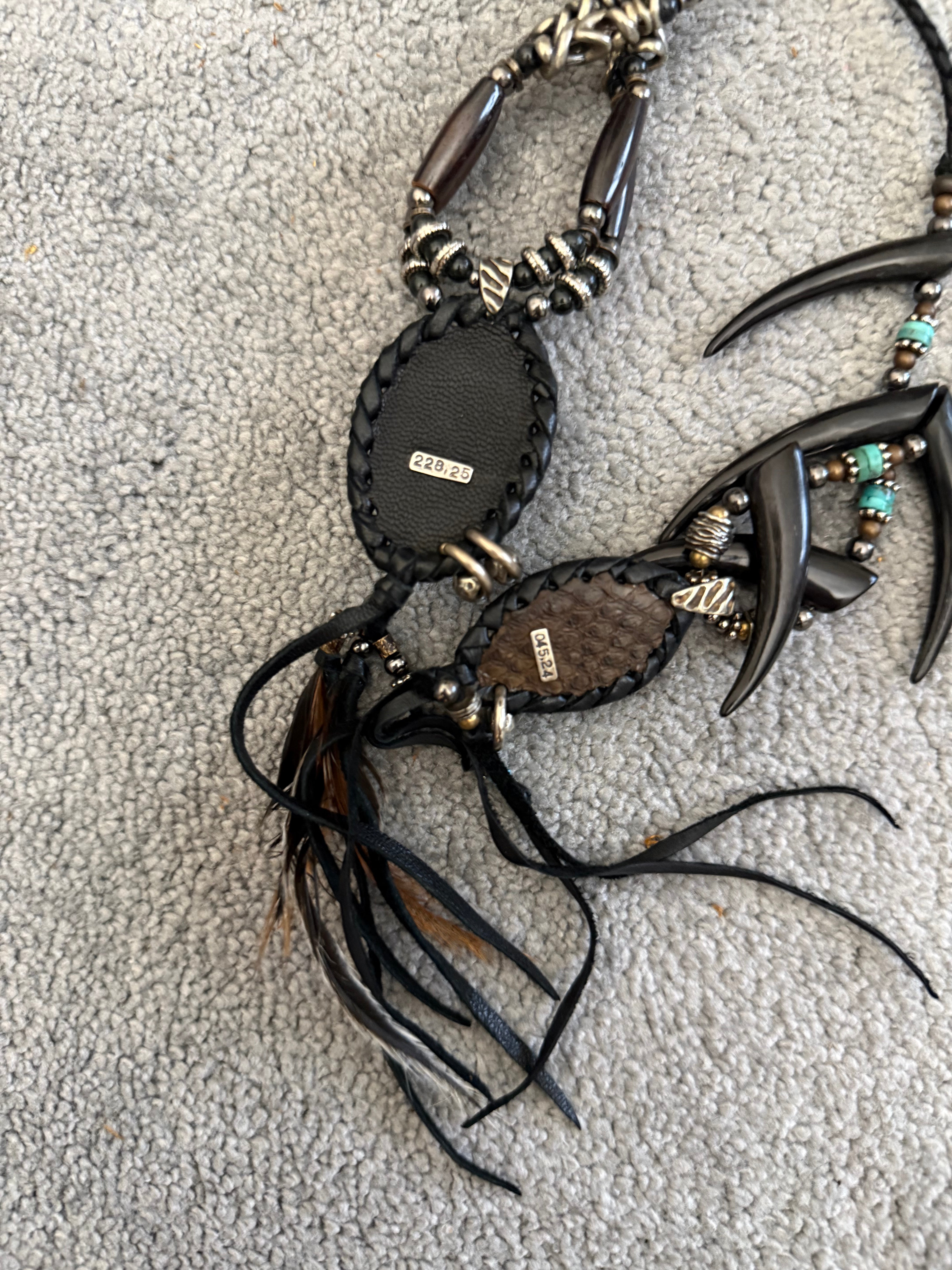 This 1/1 14th Addiction necklace features claws along the centred gemstone, feathers and leather tassels.