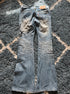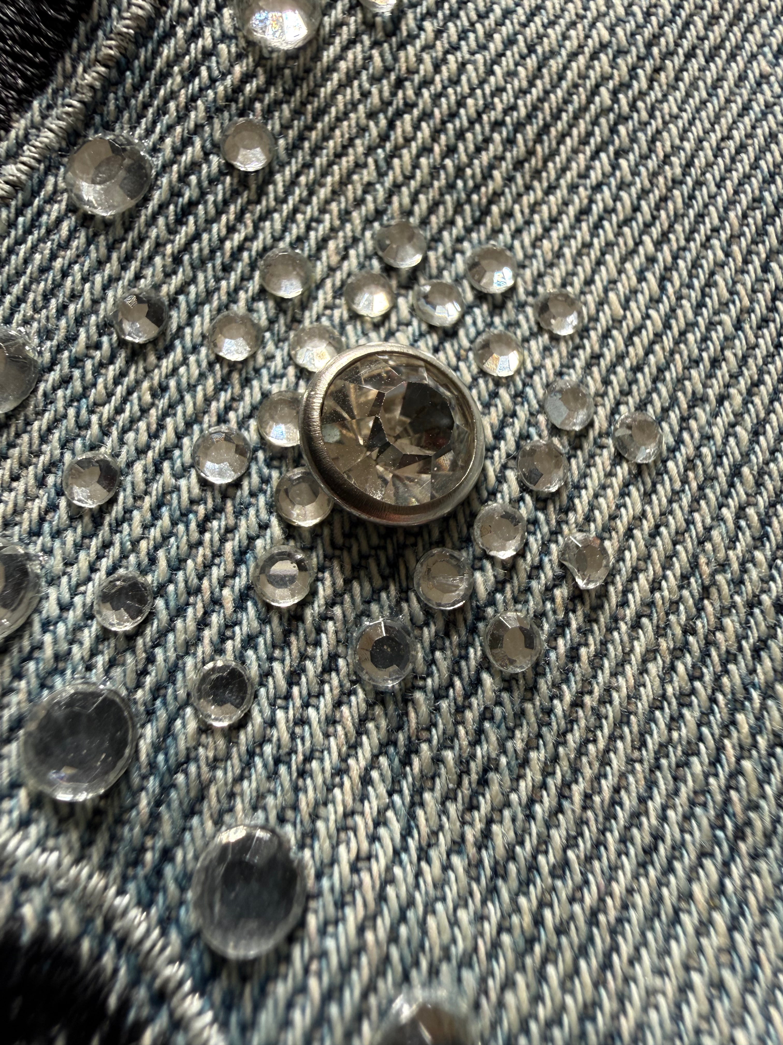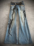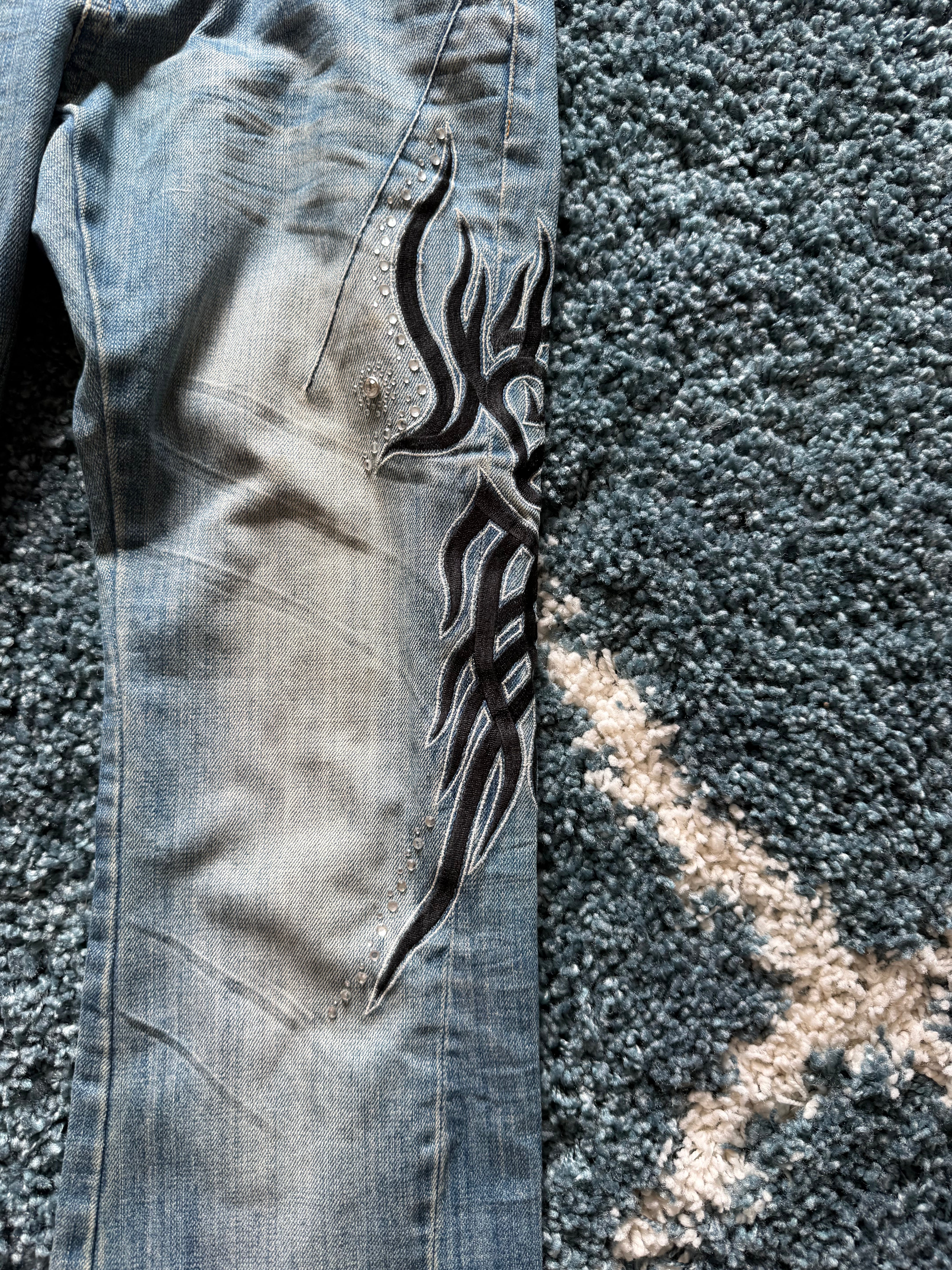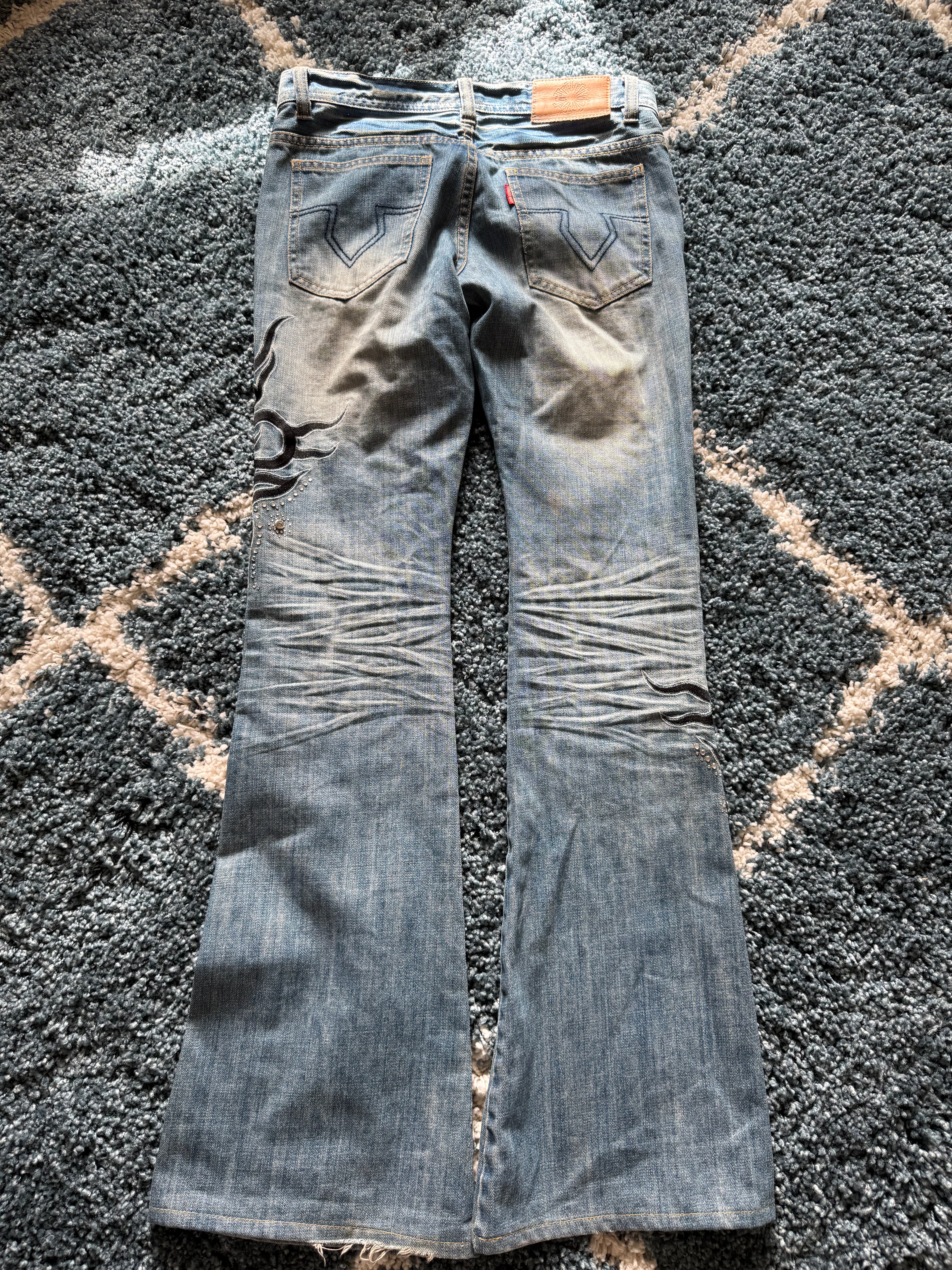 These flared jeans from Japanese brand Tornado Mart feature tribal embroideries subtly decorated with rhinestones. The design includes a studded pocket and a long inseam, creating a clean and refined silhouette.